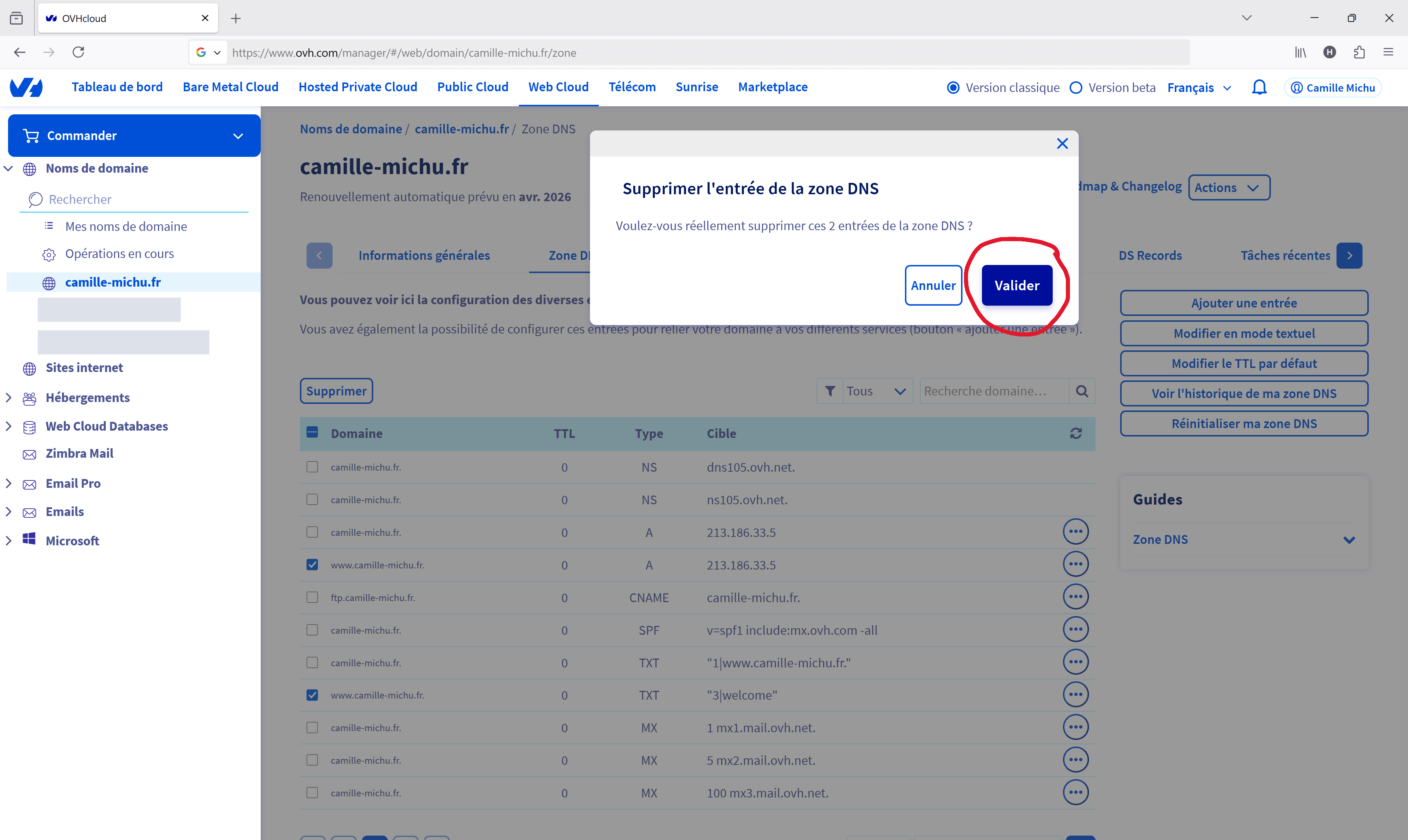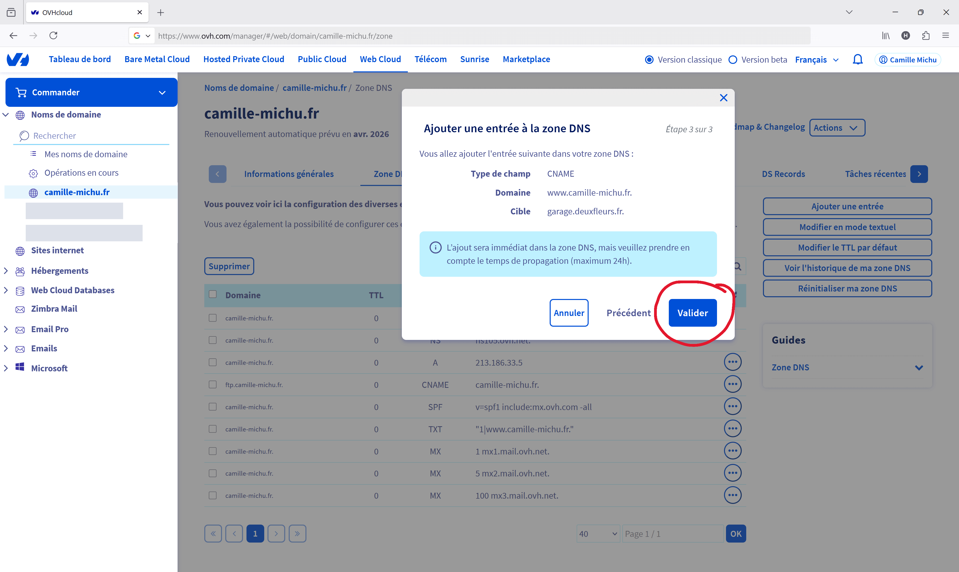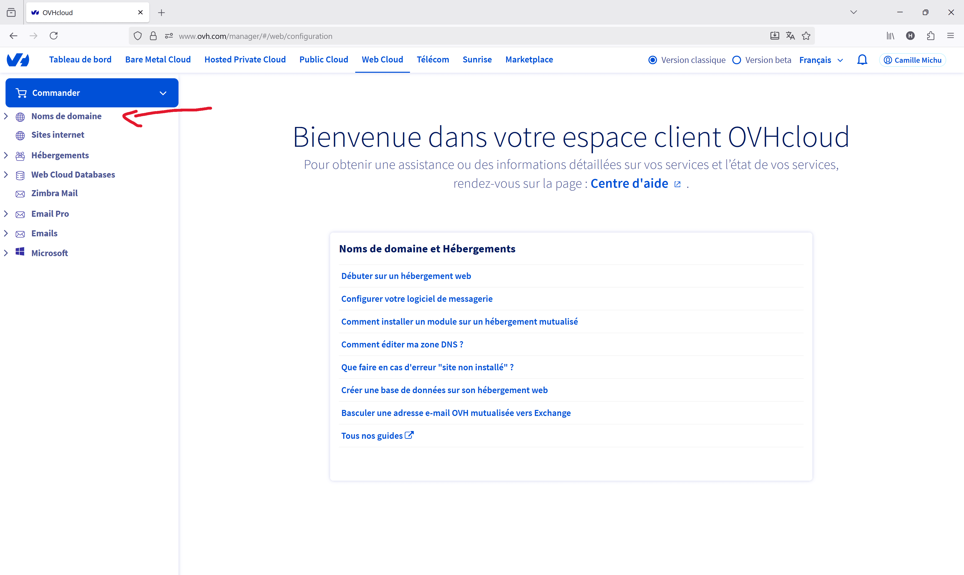 Dans la liste à gauche, cliquez sur "Noms de domaine" puis "camille-michu.fr". :