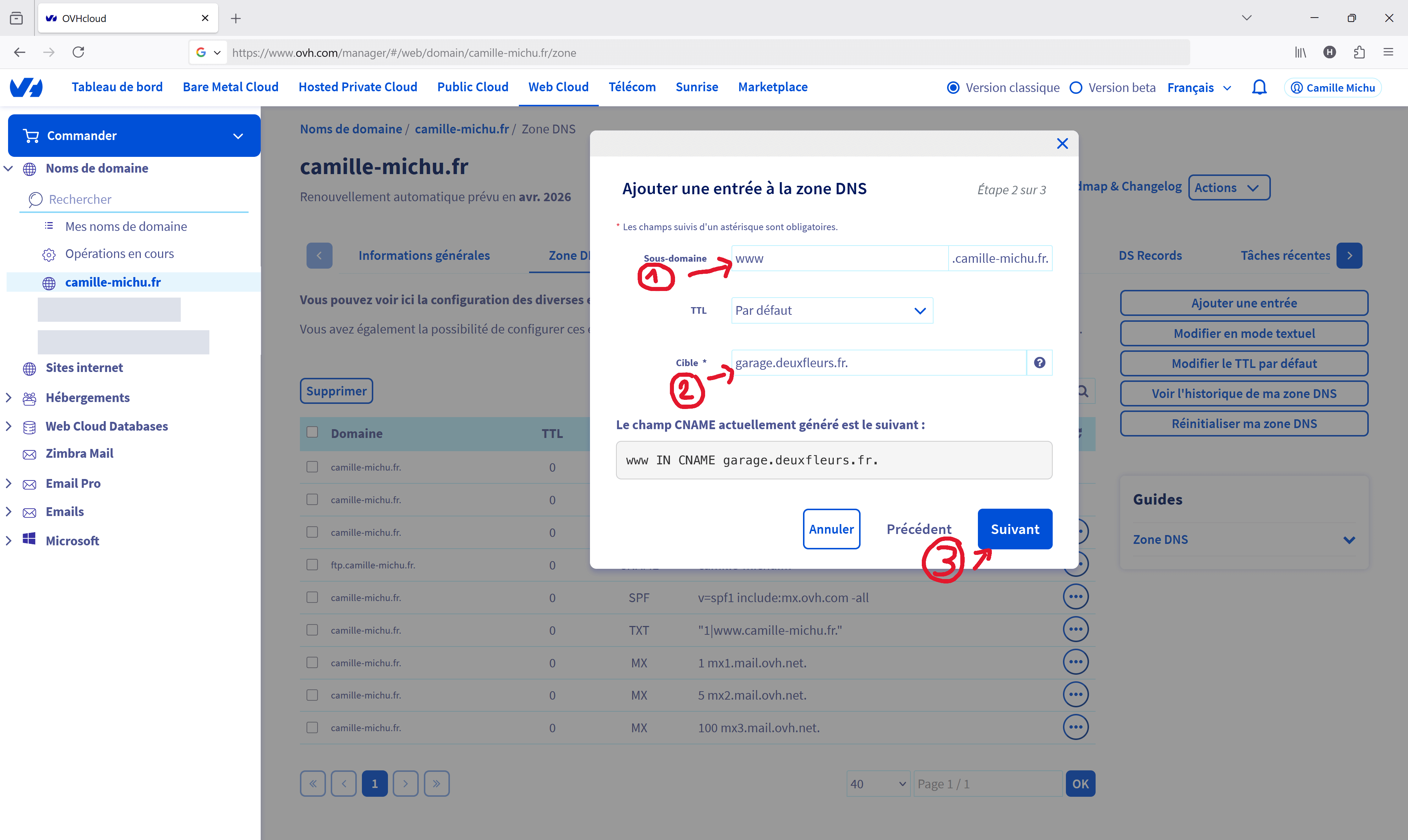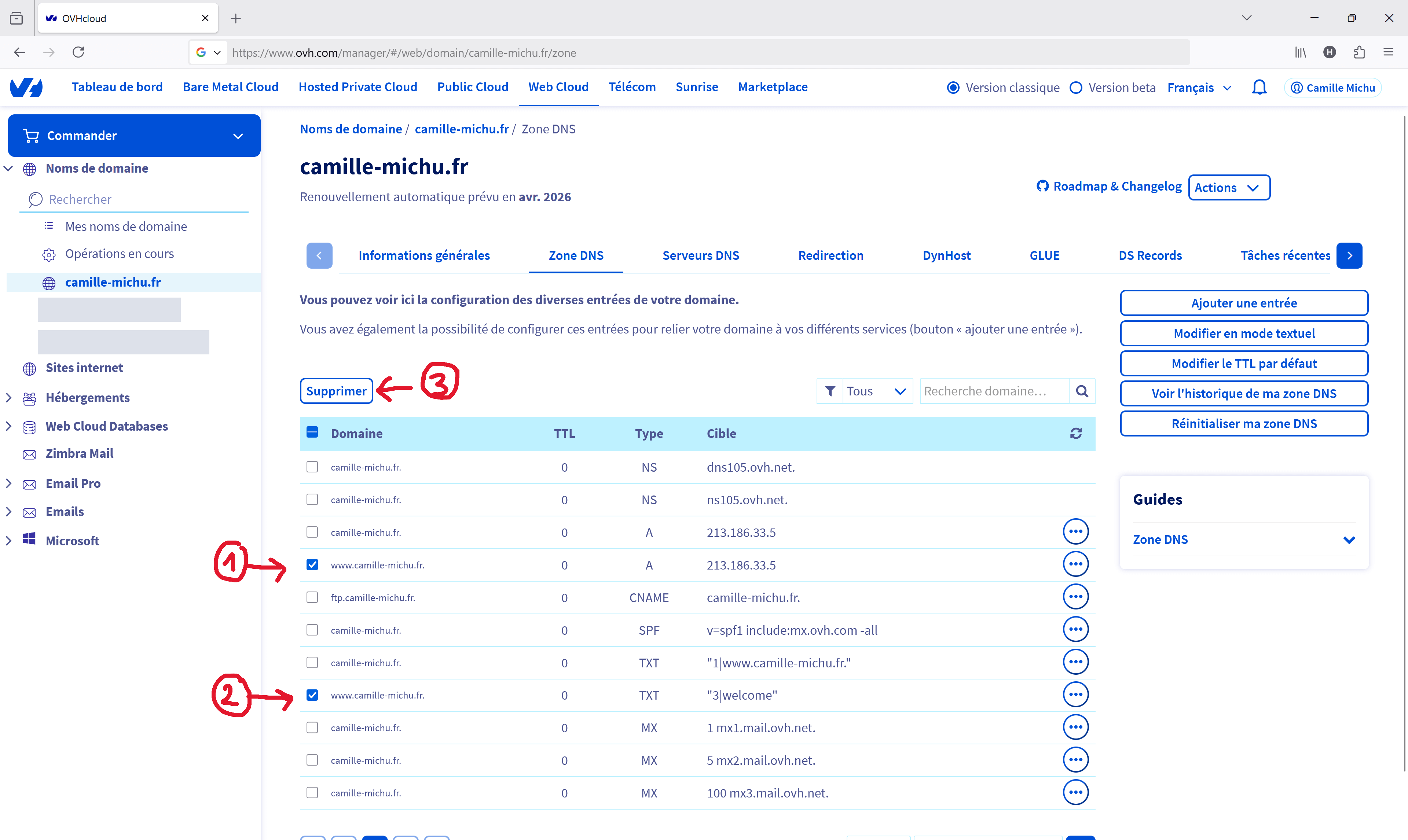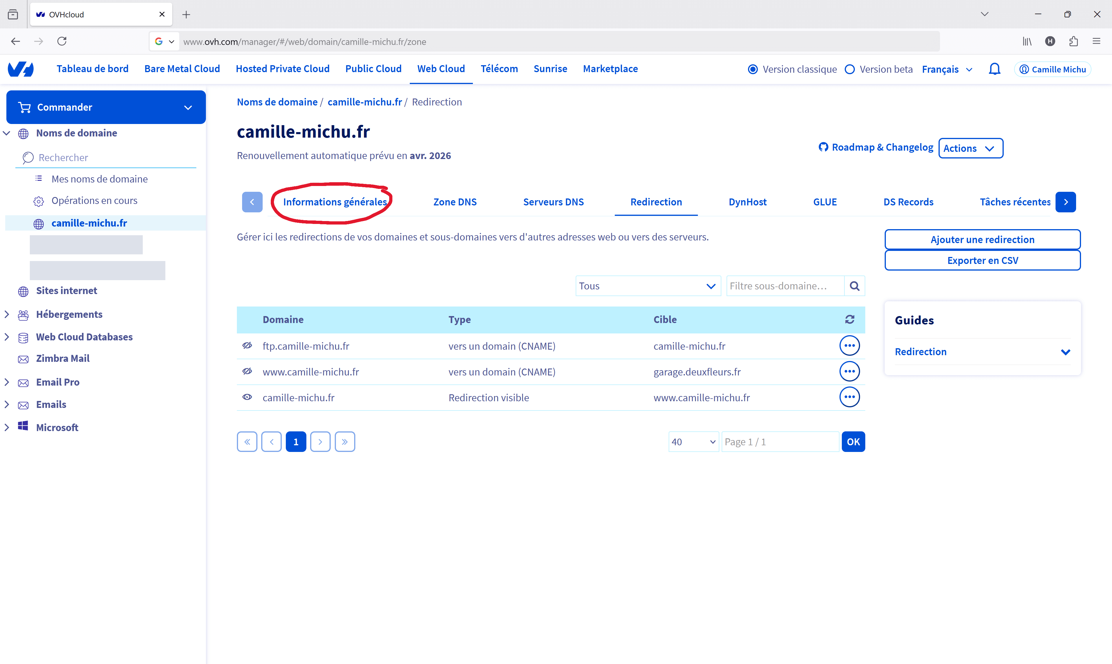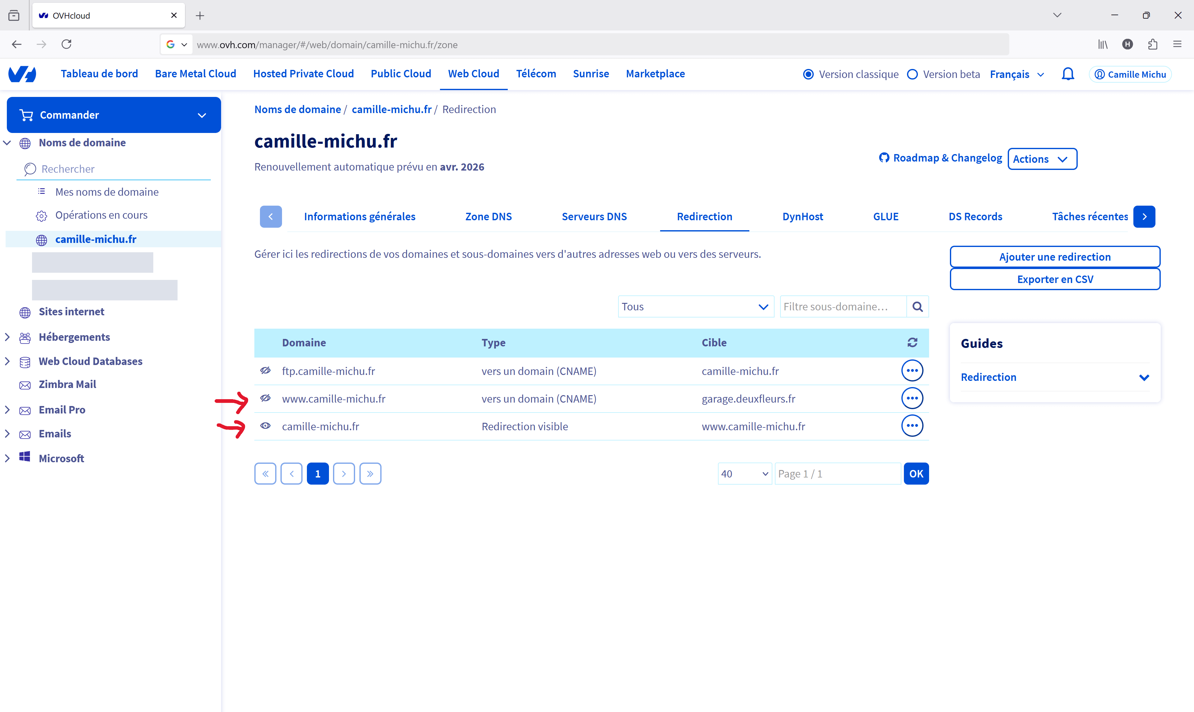Dans la liste à gauche, cliquez sur "Noms de domaine" puis "camille-michu.fr". :