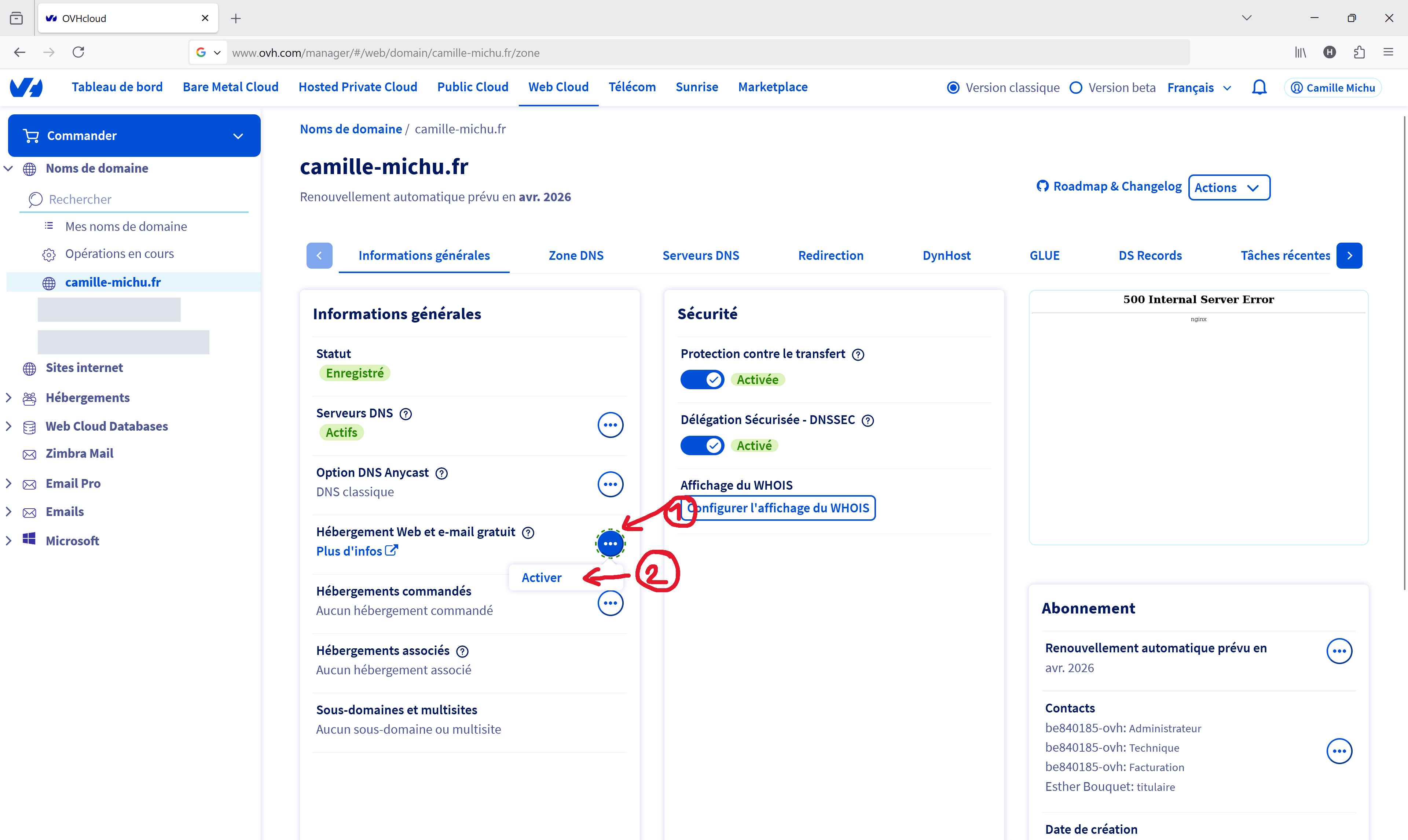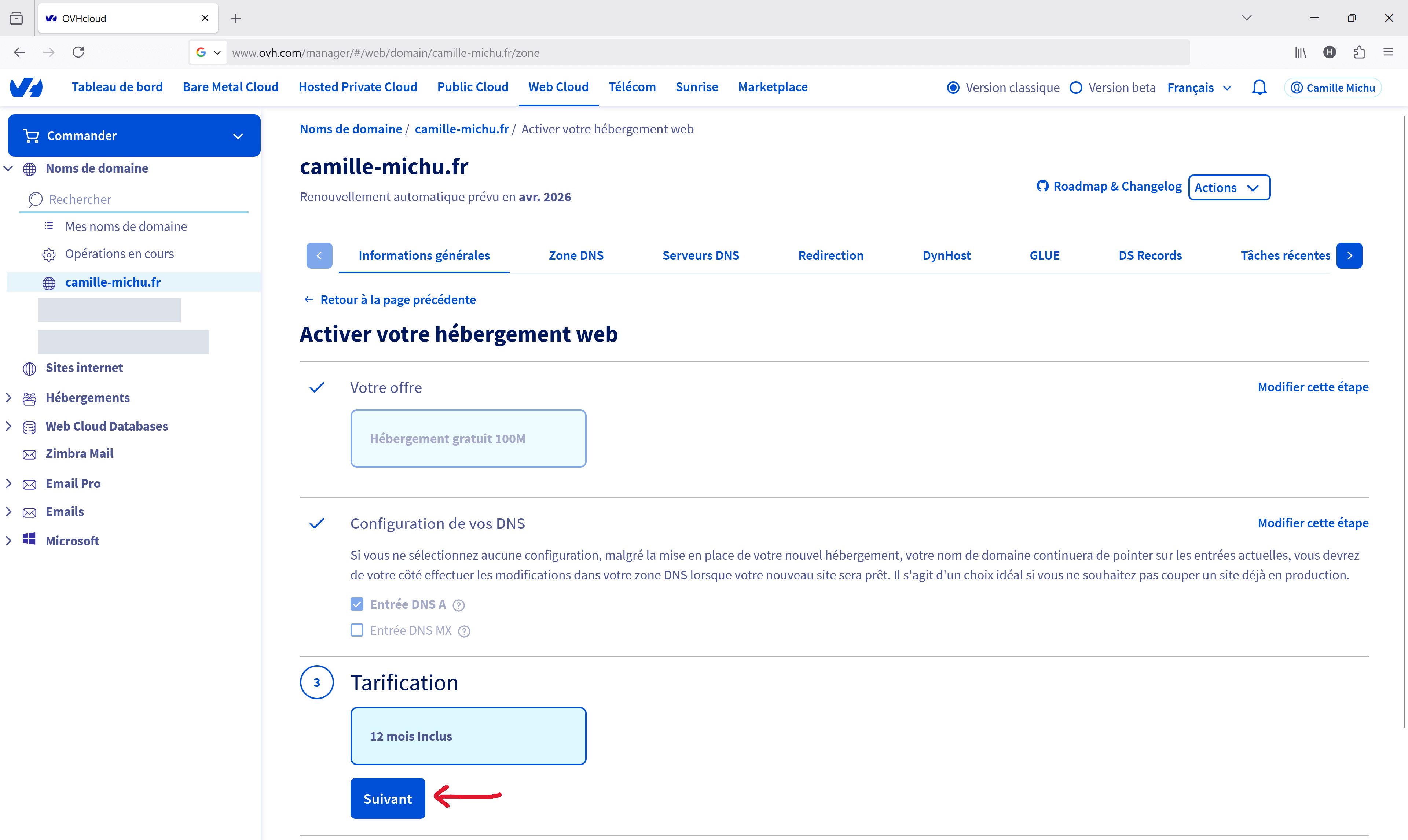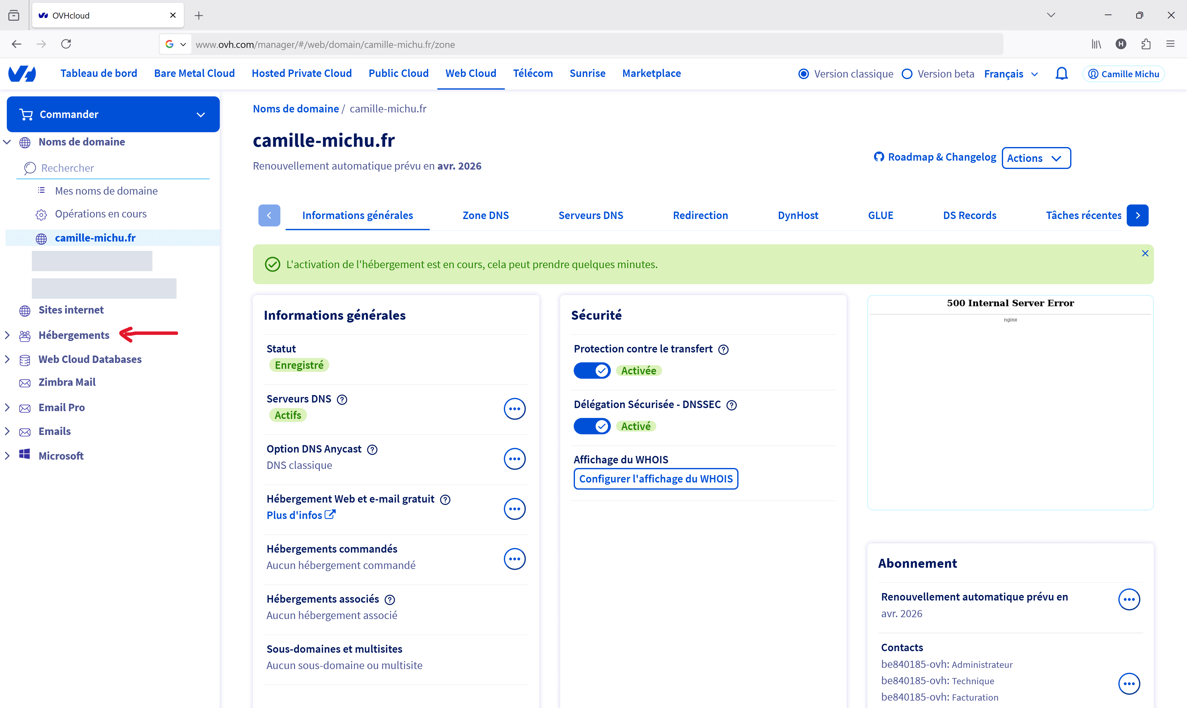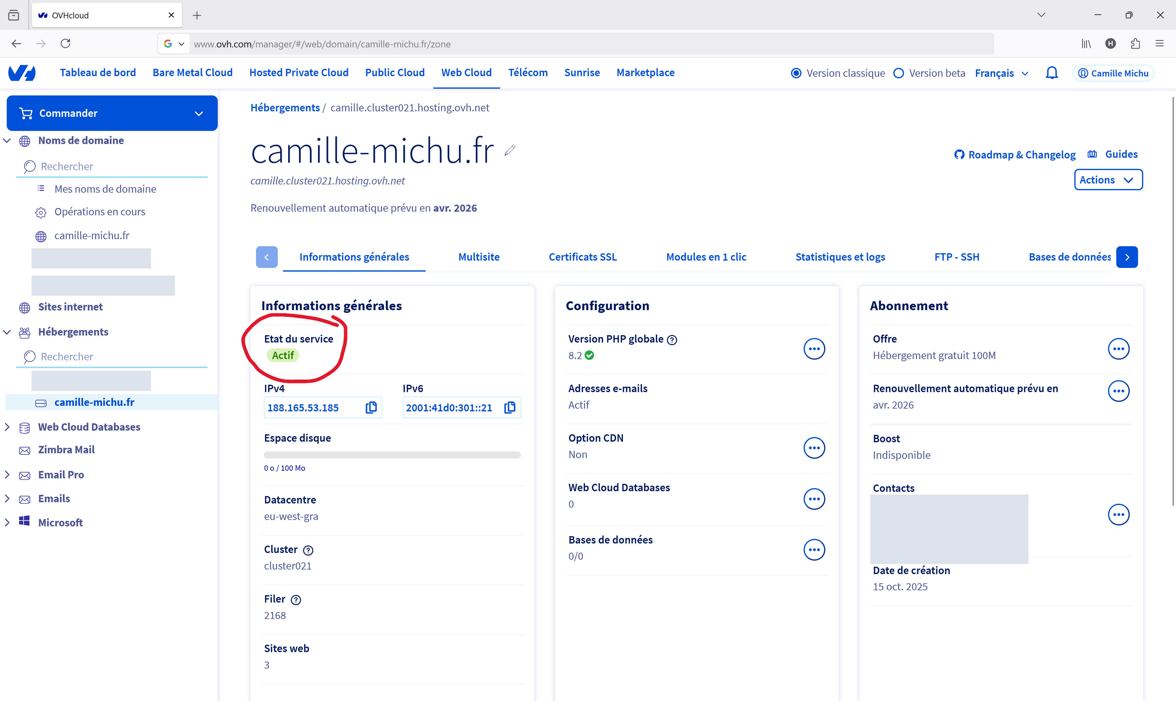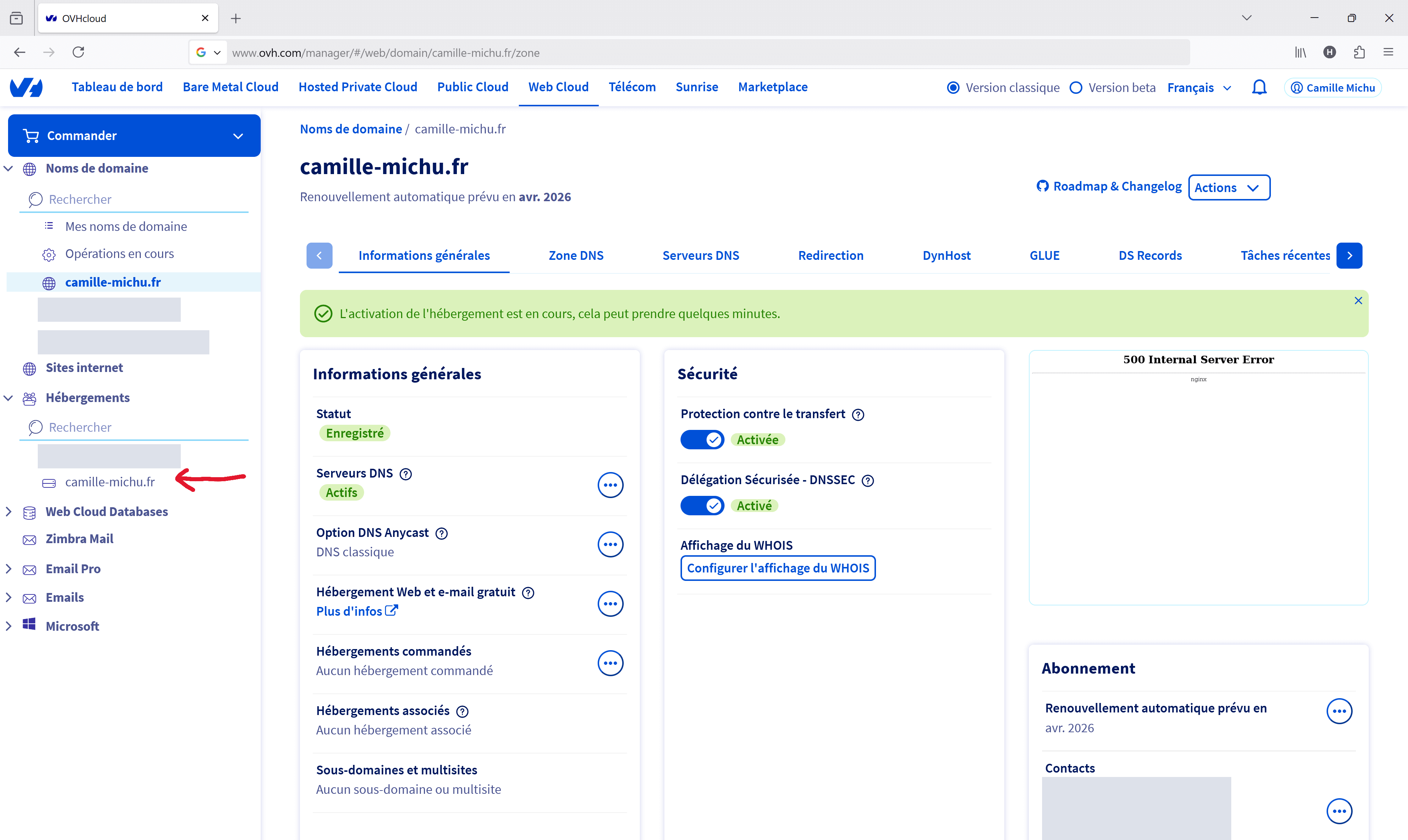 Sélectionnez "camille-michu.fr" dans la liste et vérifiez que l'hébergement est actif :