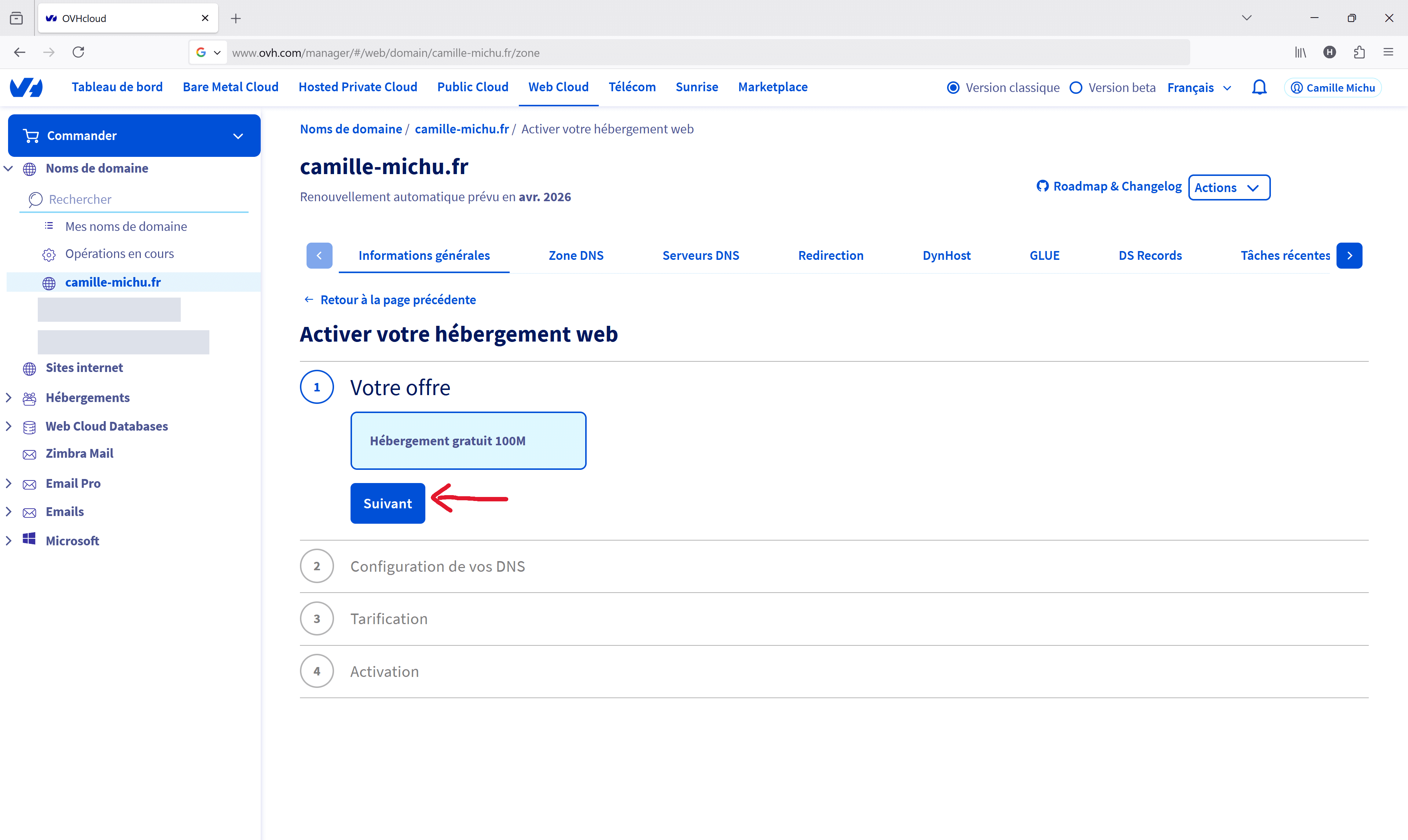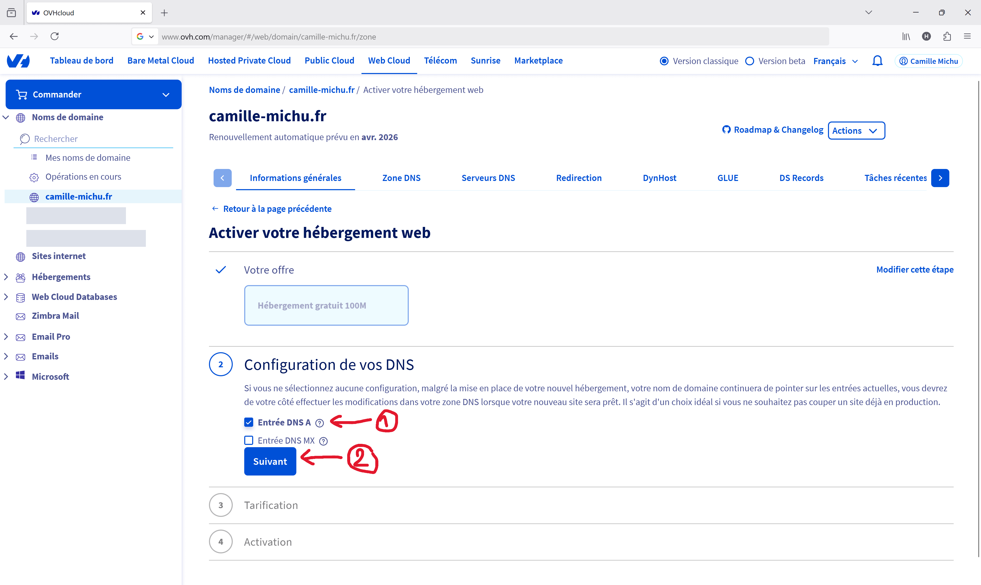 Suivez la procédure en cliquant sur "Suivant", sélectionnez l'entrée "DNS A" et cliquez sur Suivant, Suivant, Activer. Vous aurez un message vous indiquant que l'activation est en cours et en attendant quelques minutes, vous pourrez cliquer sur "Hébergements", dans le menu à gauche :