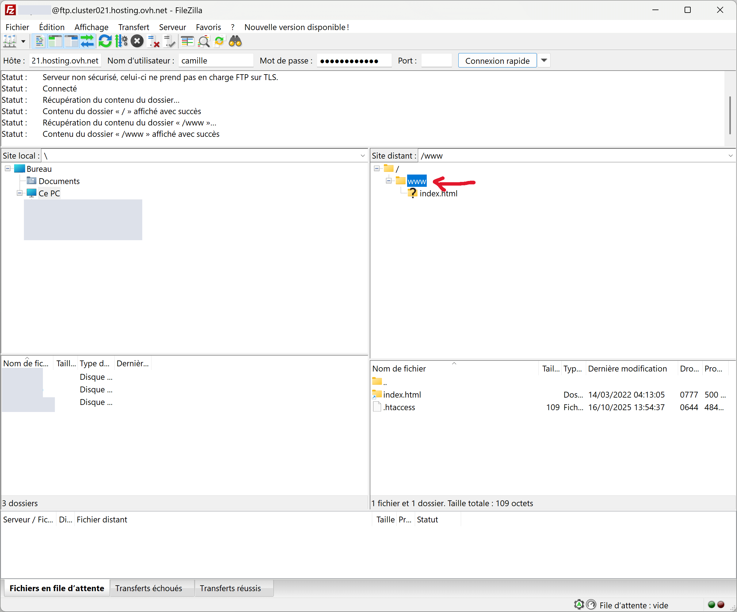 Une fois que la connexion s'est faite, ouvrez le dossier "www" en cliquant une fois dessus :